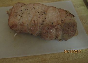 Lay out a length of plastic wrap about 2 feet in length. Spoon the apple mixture onto the plastic and make a log down the center that is about the same length as the pork loin. Roll the plastic tightly around the apple mixture and twist at the ends to secure. The log should be about 1 inch in diameter. Place the log in the freezer and let it freeze solid. This should be done ahead of time. (Ideally, do it overnight if you can. I did it for 6 hours today and it was frozen, but not solid).