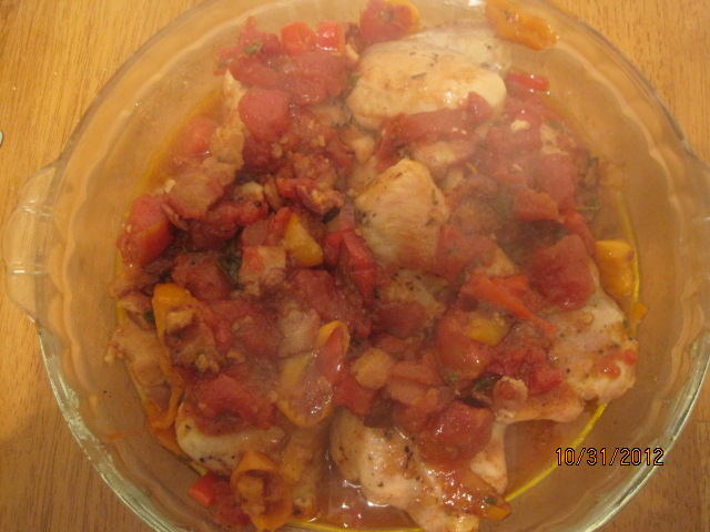 I did make a minor change to the recipe. Since I didn’t have prosciutto, I used a couple of slices of bacon in its place and it turned out just fine. I also used only chicken thighs for the recipe, mainly because that is what I had on hand and ready to cook. I think it would turn out great with any chicken parts you decided to use. You get a great sauce from the tomatoes, stock and wine that goes well with some rice or potatoes. It’s a quick and simple recipe to make for a weeknight dinner any time you are looking for something to do with some chicken.