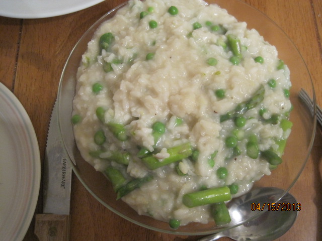 Admittedly, making risotto is a lot of work. It requires constant attention and stirring on the stove. While it can be taxing, it is certainly worth the work that you put into it. I especially liked this recipe because of the fresh peas and asparagus that are used. It is the perfect time of year to try to incorporate some of the your spring vegetables into a dish like this and they tasted great. I would certainly make this dish again.