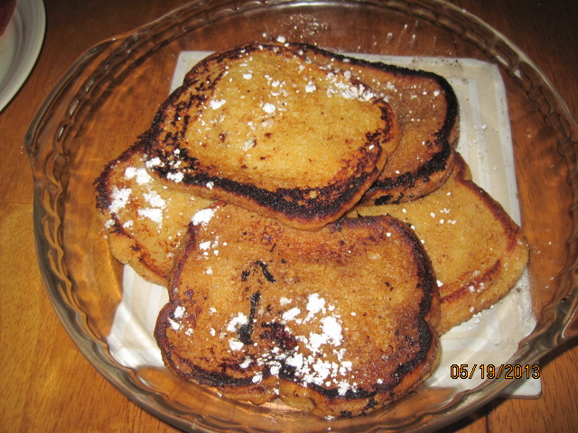 I think it came out pretty well myself considering I’m no French toast expert and Michelle and Sean both seem to really enjoy it. It was a little more work toasting the bread before you actually make the French toast, but I think it came out better because the bread isn’t nearly as soggy as I’ve seen in the past. I think between using only the yolks of the egg and adding some melted butter to liquid it gives the toast a chance to be not nearly as soggy and a little more rich.