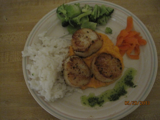 This dish looked very nice and tasted fantastic. The scallops were cooked perfectly and I loved the combination of the carrot cream and the pickled carrots with the scallops themselves. The herb oil added a nice contrast to the dish with the parsley and marjoram. It seemed like a perfect combination. I also had plenty of oil left over to use for other dishes down the road. I served this with some white rice and broccoli to round out the meal.