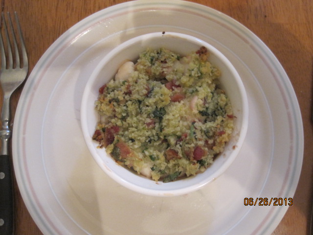Just a couple of things about this recipe. Since I was only making this for 3 of us, I cut the recipe in half and found that a pound of bay scallops was more than enough for 3 dishes. The recipe does call for a couple of items most people may not have on hand for cooking, but there are substitutions available. I do not have prosciutto on hand most times, so I simply fried a couple of pieces of bacon beforehand and crumbled them up to use in the dish. If you don’t have any white wine on hand or don’t like to cook with alcohol, don’t fret. I didn’t have any white wine either and just dotted the bottom of each dish with some extra-virgin olive oil. You could easily leave it out of the dish altogether. The same can be said of the Pernod, which is a particular brand of anise flavored liqueur. If you have anisette, ouzo or Sambuca, you can use them in the recipe instead if you really want the licorice-like flavor you get from them. I didn’t have any of them on hand, so I simply left it out and I don’t think it hurt the dish at all. One final thing about scallops in general – don’t overcook them. Scallops, whether sea scallops or bay scallops, need to be barely cooked cooked, just until they are opaque, otherwise it will feel like you are eating pencil erasers.
