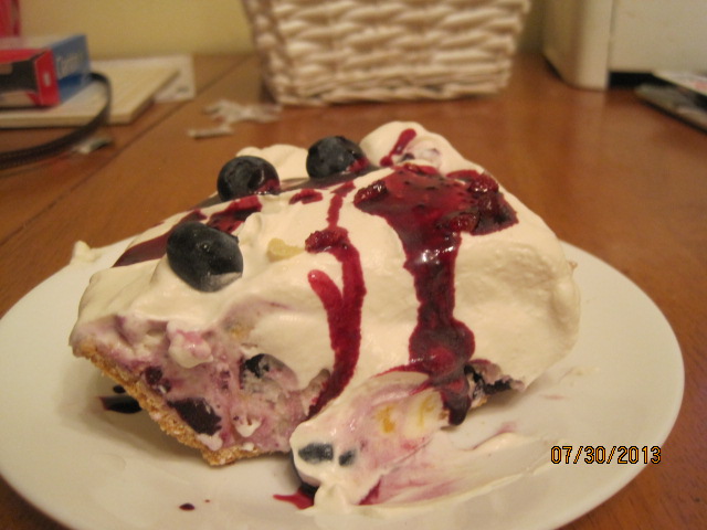 Soften the pie in the refrigerator for 10 minutes before serving. Top the pie with the whipped cream; scatter the remaining 1/4 cup of blueberries over the top. Garnish the top with the crystallized ginger. Drizzle each slice with some of the reserved blueberry juices.