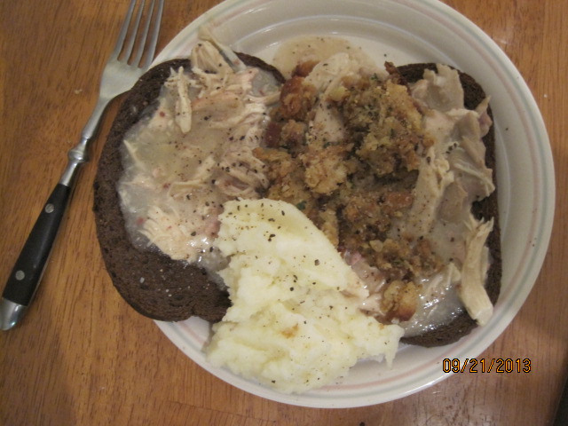 It is getting into that turkey time of year. For most of the year, turkey is kind of expensive and not something I buy very often, unless it is ground turkey. Even just getting a turkey breast can be kind of pricey. The other problem I have is unless we are having people over for dinner, it just doesn’t make sense to buy a huge turkey for just the three of us. That being said, last week I had a hankering for some turkey and bought a 15 pound one. Needless to say, after I made it we had lots of leftovers. I was able to use the carcass to make some turkey stock, which will be used in soups this week. I also made some turkey salad for lunches for Michelle and myself. That still left us with leftover turkey, mashed potatoes, stuffing and gravy. What better way to make use of them then to make some open face sandwiches for dinner the other night?