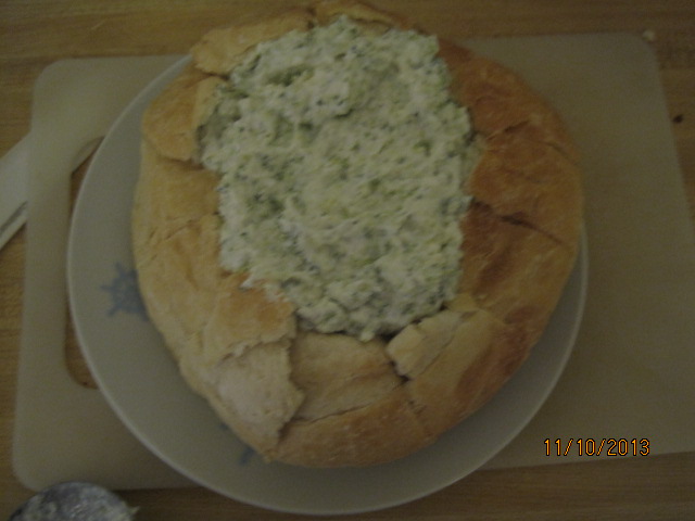 You want to try to remember to have some appetizers on hand for your holiday or Thanksgiving meal to keep everyone happy before the big meal comes out. There are lots of things that you can do that are easy, like making a simple antipasto platter, some shrimp cocktail, crackers and cheese or even just some onion dip and chips. One thing that can be a little different and look fancy is this recipe I got from Cook’s Country for broccoli dip in a bread bowl. It is really easy to make and you can make the dip a day or two in advance and then just put it all together right before you serve it.