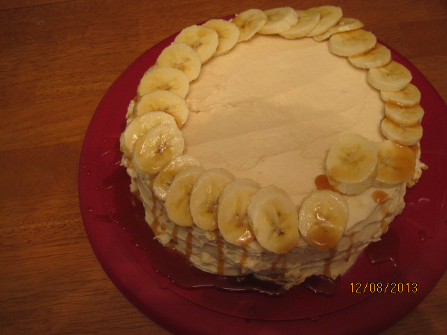 To assemble the cake: Place 1 cake layer on a cake plate or pedestal. Spread half of the banana filling over the cake. Top with the second cake layer and the remaining filling. Top with the final layer of cake and frost he top and the sides of the cake. Just before serving, peel and cut the remaining 2 bananas into 1/4-inch-thick slices and shingle them around the top edge of the cake. Pour the reserved caramel-butter mixture over the bananas, allowing the excess to drip down the sides of the cake. Serve.
