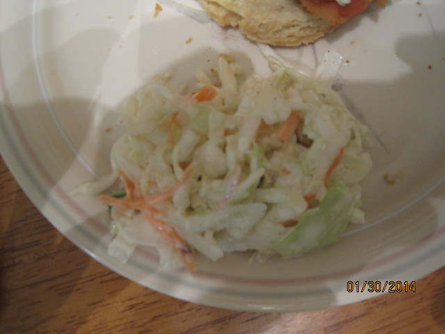 On the night where I made the fried chicken biscuits, I also tried a new recipe for some coleslaw. I have a bunch of different coleslaw recipes and I am always trying something a little different. This time, since I had some buttermilk on hand I thought I would try out this buttermilk coleslaw recipe from Cook’s Country. it uses a couple of ingredients to make it really creamy without being too watery.