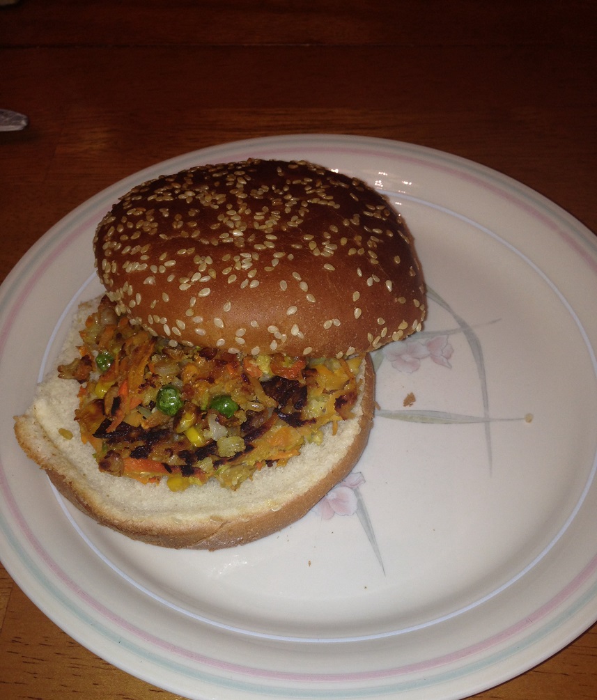 Okay, here are a couple of things we noticed in this recipe. First, this recipe makes a lot more than the 6 portions the recipe purports to make. We had over twelve patties when all was said and done, so you can bake them and freeze them so you always have some ready to make when you feel like having one and just defrost it and bake it in the skillet. Second, these burgers do not hold together well because there is not much to bind them. We actually experimented with another batch and added 1 beaten egg to the mix and they held together much better than the first batch. From what I have been able to see about the Sparrow Diner, while they call it a burger, it is not really served as a burger that holds together, which is why they serve it in a pita, which is fine, but we wanted more of a burger texture so we added the egg and served it on a hamburger roll. Finally, for the sauce, I cut back on the cayenne pepper. Three tablespoons is a lot of cayenne pepper, so if you like it hot, go for it, but if you want something milder, cut back a bit and you will have a great sauce. Michelle and I both liked the results of the burger. It had great flavor with all of the vegetables and we enjoyed. In the interest of full disclosure, Sean hated it. He didn’t like the taste and said it didn’t hold together well, but I think for the majority of teenage boys who hear they are having burgers for dinner it was an understandable reaction. He did eat it, but he wasn’t happy with it, so next time around I guess it is just for me and Michelle.