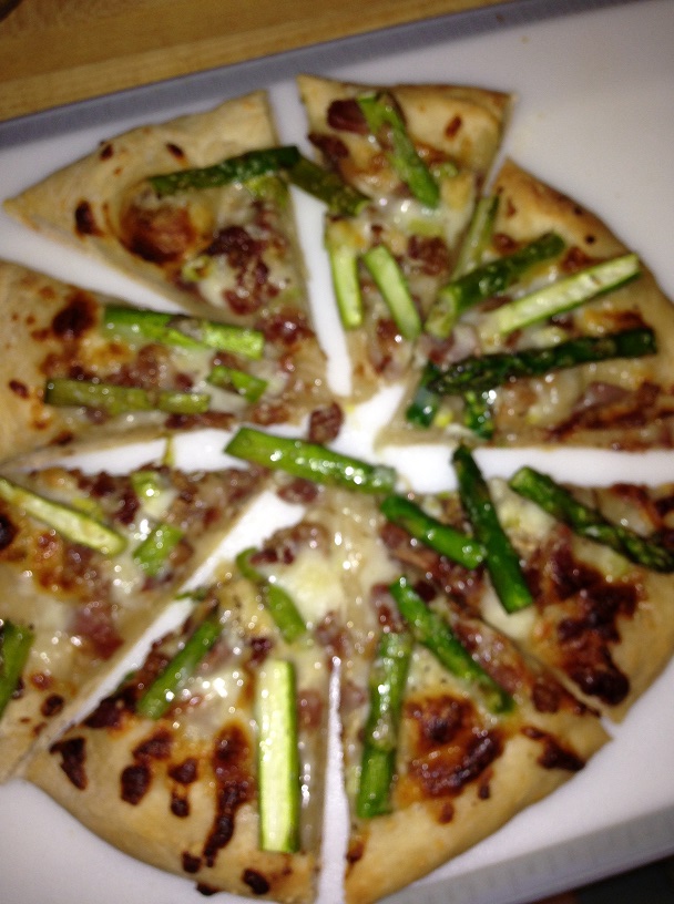 The pizza had some great flavor from the bacon and asparagus. I loved the asparagus; it had the same roasted flavor I get when I roast it in the oven and the mix with the bacon and just a hint of red pepper flakes and scallions was perfect. This makes a great appetizer dish, a snack for watching the game or just for something different on Fridays for pizza night. You could easily leave off the pancetta or bacon altogether and make it a vegetarian pie.