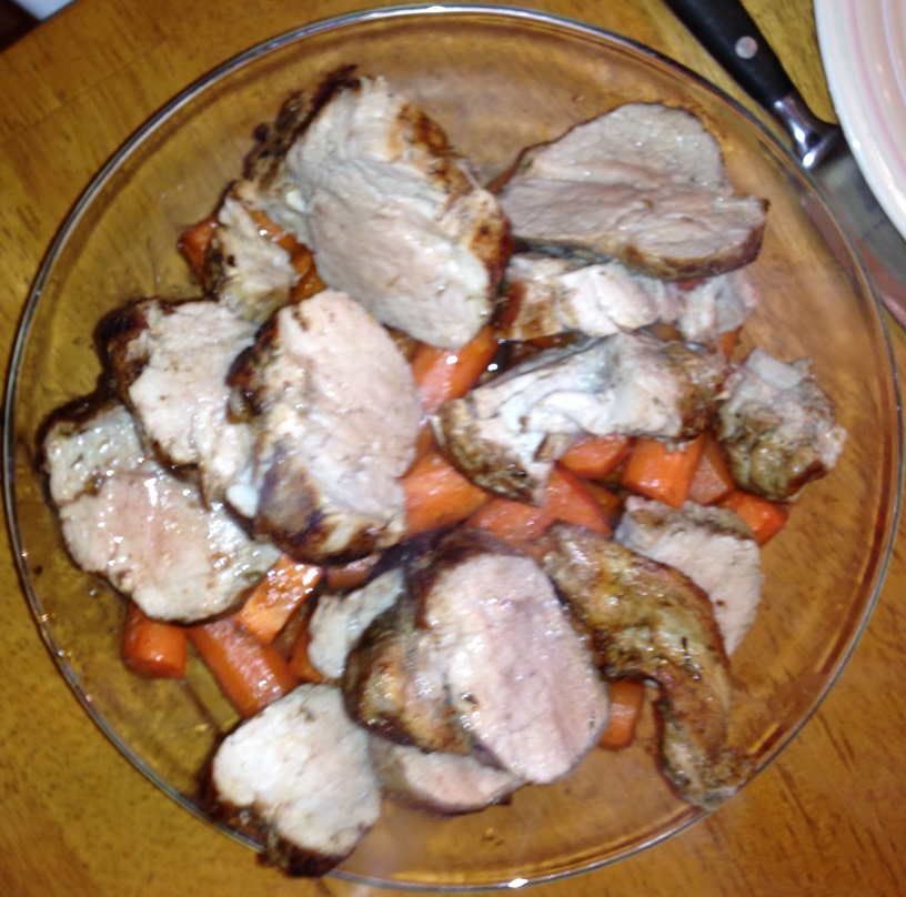Pork tenderloin is a great choice for a weeknight meal when you want something that seems a little more elegant and fancy and can still be done in under 45 minutes or even thirty minutes. I usually but tenderloin when it is on sale and since they come in a package of two tenderloins I freeze one and make one for dinner so I can always pull one out to have for a meal. There are lots of great things you can do with the tenderloin – roasting, grilling, pan roasting, cutting it into medallions, cutting it up for a stir fry – but I really liked this option of adding some nice spices to the tenderloin and roasting it with some carrots for a nice meal. This recipe comes from Bon Appetit and is for a spice-rubbed pork tenderloin with roasted carrots.