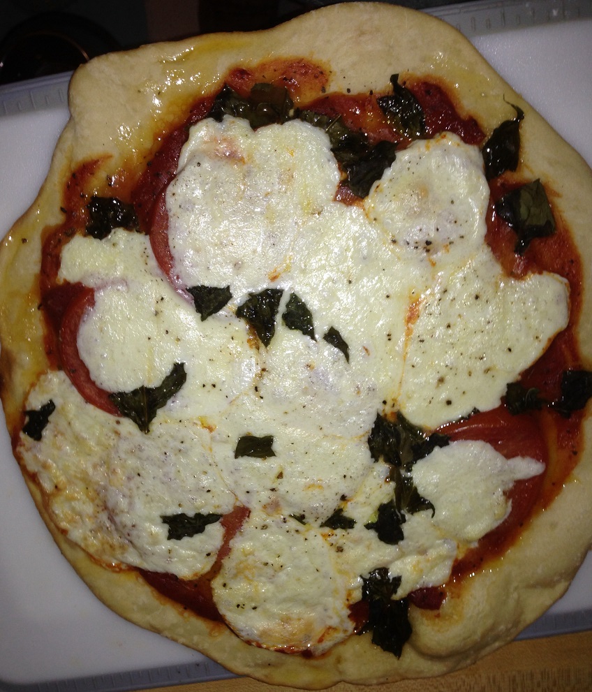 If you want to make a quick homemade tomato sauce that is perfect for the pizza, in a food processor, whiz together whole, drained canned tomatoes, a splash of olive oil and a sprinkle of salt and you are good to go. I actually put a couple of slices of tomato on mine as well just to round it out and I used a little more cheese than the recipe called for. The pizza has a nice thin crust and great flavor with just the simple ingredients so you can make this easily at any time.
