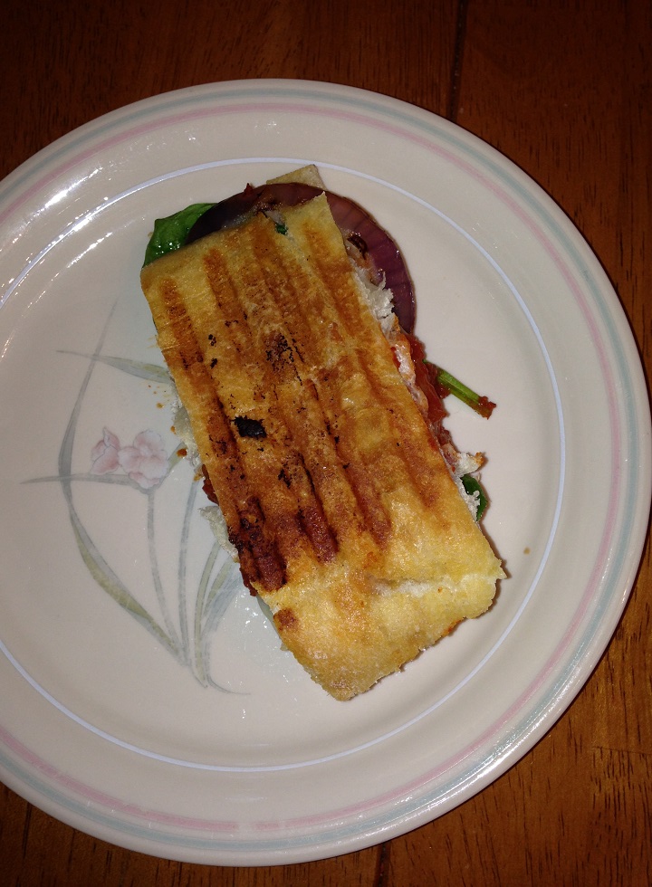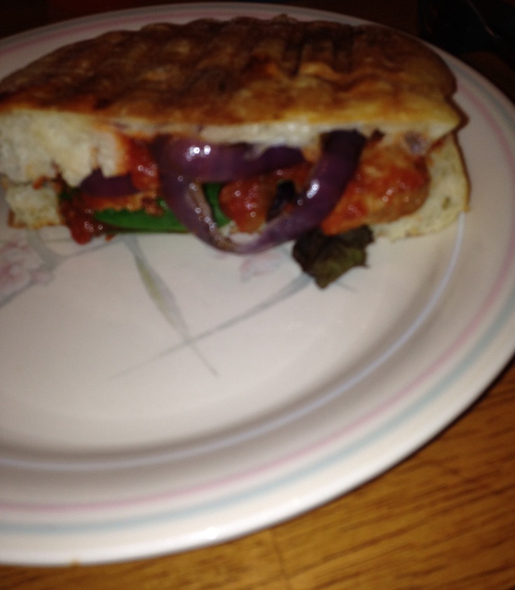 The great thing about paninis, or any sandwich really, is that you can put whatever you like best on them. If you don’t like provolone, use your favorite cheese on it instead or no cheese at all (which is how I eat it). If you don’t have prosciutto, use any type of ham that you like (which I did for Sean; I used Black Forest Ham). you can use any type of other toppings that you really like or use different meatballs and still get good results (those these meatballs are really good and you should try them out). I had mine with just the grilled onions, meatballs, red pepper flakes and arugula. Michelle had hers with the meatballs, arugula, grilled onions and provolone. Sean had his with the meatballs, Black Forest Ham and prosciutto, no onions or arugula. They all looked really good and everyone really enjoyed the sandwiches. It was a great way to re-purpose some of the meatballs for a quick meal.