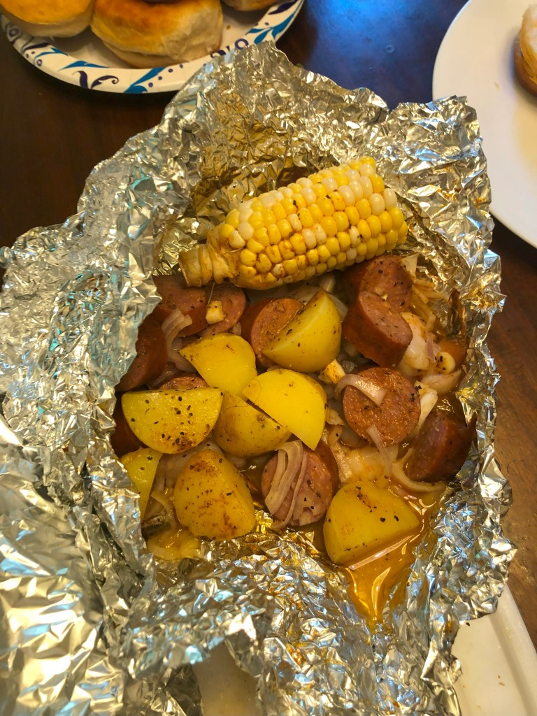 I did use the oven for mine and baked them for 15-20 minutes to get the potatoes tender, and it worked out well for me. Giving the potatoes a head start in the microwave helps to soften them nicely so they cook in a shorter amount of time and give you the creamy texture you want while also melting them in the butter. I also added one chopped shallot and distributed it evenly among the packets for a little added flavor. Everything was cooked perfectly, and I loved the mixture of the andouille with the shrimp. I made 1 packet without Old Bay because Michelle isn’t a big fan of the seasoning, but Sean and I enjoyed our packets with the added spice. Best of all with this recipe is that they are no pans to clean up! I do recommend using heavy-duty aluminum foil for this recipe so the packets don’t tear easily. If you don’t have it, double-wrap the packets in an extra layer of foil.
