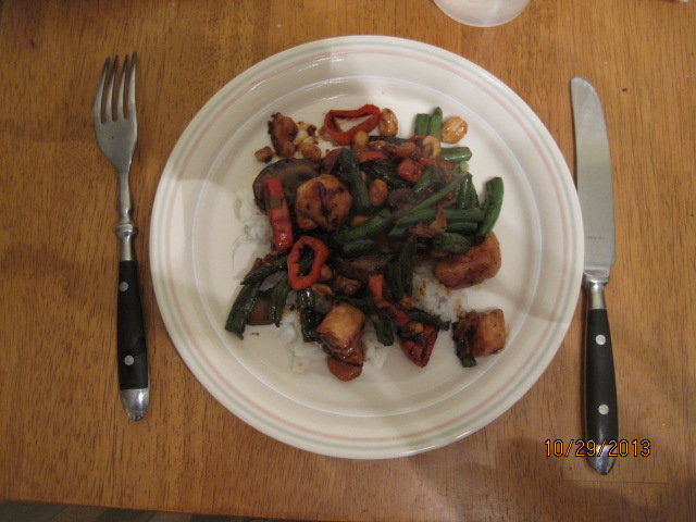 There are a few things about this dish. First, if you can’t find Sichuan pepper (and it may not be readily available), there is a Sichuan oil that you can get instead to use. It doesn’t add any heat to the dish but has a lemony flavor to it. you can always omit it from the dish if you can’t locate anything else. The peppercorns are often used in Chinese five spice powder. The same goes for the dried chiles. My family does not like things very hot, so I simply went with red bell peppers and added some chili oil for a little bit of heat. One thing you do need in this dish is the peanuts. Michelle and I both agreed the peanuts made the dish. They add great crunch and flavor. You can buy already roasted peanuts in the store or you can roast your own in a 250 degree oven for 15 to 20 minutes. Just watch them closely because they can burn pretty easily. I stir-fried some green beans, mushrooms and carrots in a separate skillet so we had some vegetable with the meal and also served it with white rice. I loved the flavor of the sauce and marinade and the peanuts really gave a lot to the dish.