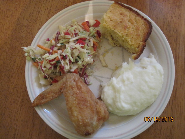 To go along with the recipe, I did make some mashed potatoes and coleslaw. I also had some extra cornmeal laying around so I decided that it would be a good opportunity to try and make some cornbread. I’ve made cornbread before and posted the recipe on this blog, but in the past I have made Southern-style cornbread that is made right in the cast-iron skillet. Since I was already using my cast-iron skillet for the chicken, I needed to find a little bit of a different recipe to use. The Cook’s Illustrated Cookbook has a good, general all-purpose cornbread recipe that you could easily use for this or use as part of a stuffing if you are going to want leftovers for that purpose.