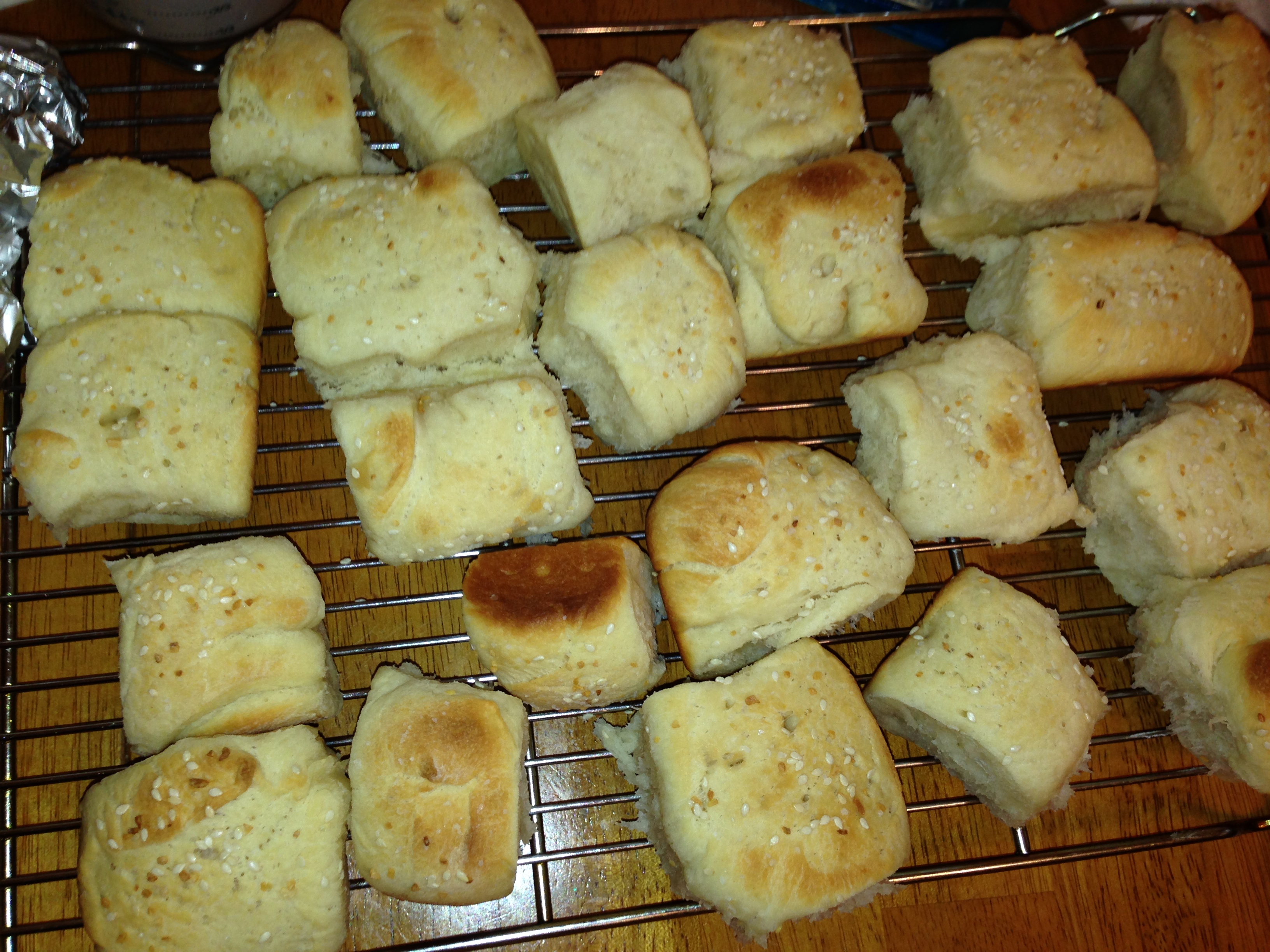 Line a baking sheet with parchment paper and spray it with some nonstick cooking spray. Divide the dough into 3 equal pieces and roll out each piece into a rope that is about 2 inches in diameter. Cut each rope into 1-inch pieces (larger if you are looking for bigger rolls). This should give you roughly about 35 small dinner rolls. Place the rolls on the prepared baking sheet about 2 inches apart. Cover the rolls with a clean dishcloth and let them rise again for about 30 minutes.