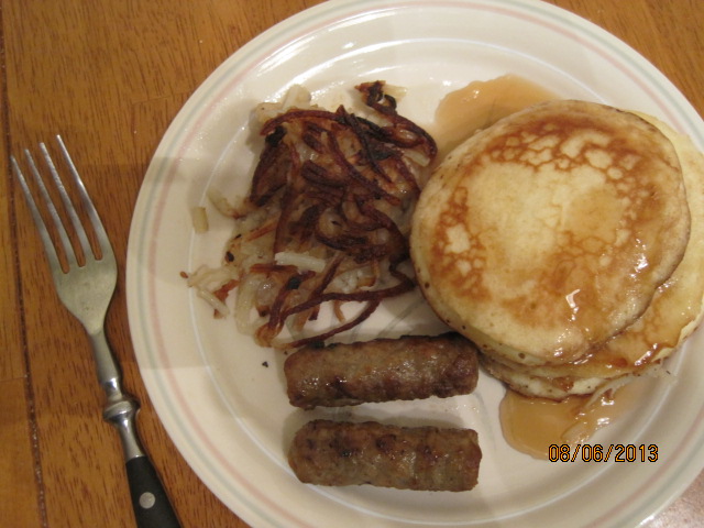 Since we had pancakes already, I wanted something extra to go with it since this was dinner. I have had a hankering for some hash browns lately and I saw this simple recipe from America’s Test Kitchen and decided to give it a try. This was much easier to do with the food processor, but if you don’t have one, you can use a box grater (just watch your knuckles!).