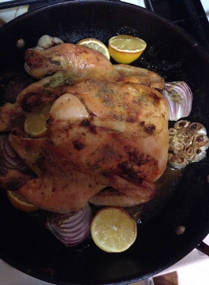 Let the chicken rest for 10 minutes before carving. Plate chicken with a mix of roasted veggies and the vegetables from the pan. Spoon the reduced cooking liquid from the pan over the top.