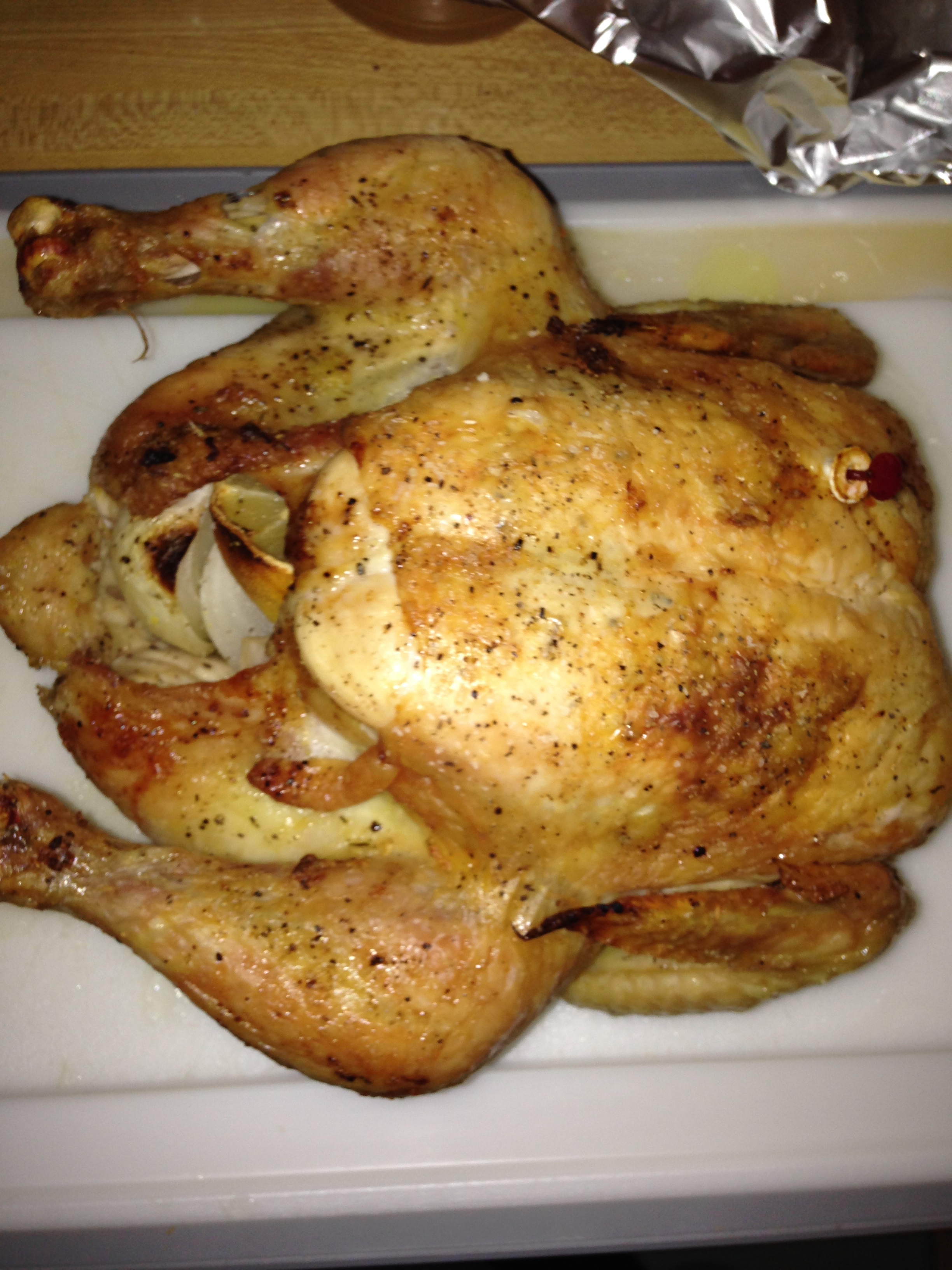 Rub the olive oil all over the chicken to coat it and then sprinkle on the herbes de Provence and sprinkle some of the herbs inside the chicken as well. Sprinkle the top of the chicken with pepper. Take the 1/2 a lemon and place it inside the cavity of the chicken.